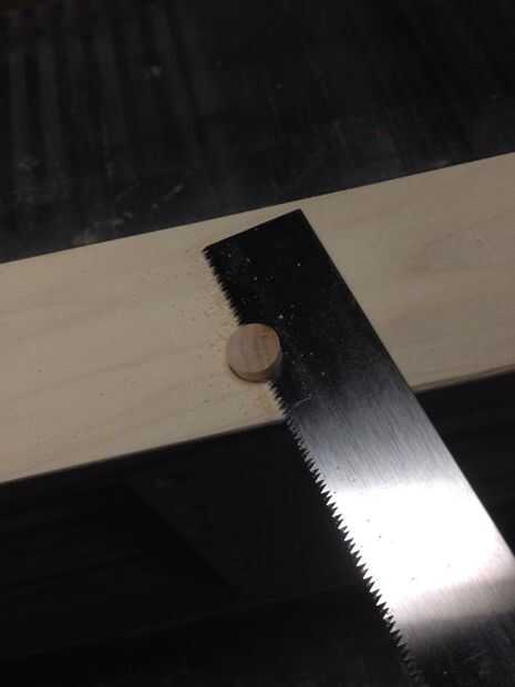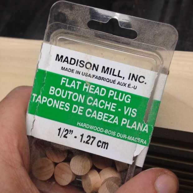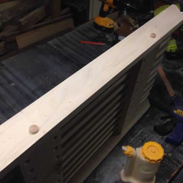 Levante la mesa por su lado, vierte pegamento en tus orificios e inserte un enchufe en cada uno, da un poco de toque o golpee un poco si necesario con un mazo para fijarlos y luego hacer lo mismo al otro lado.
