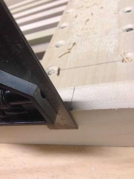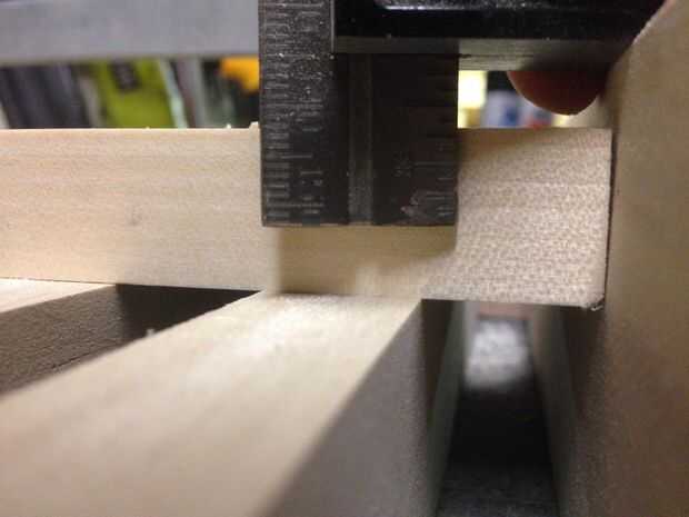 Tomar una medida desde la parte superior (realmente cuando volcó es la parte inferior) de su baranda del lado (1 x 3 x 46") en el centro de la Cruz de la ayuda. Transfiera esta distancia sobre fuera de su carril lateral y alineando con las marcas anteriores de la Cruz admite, haga una marca.