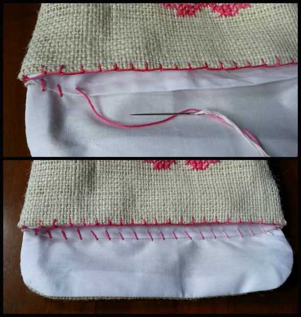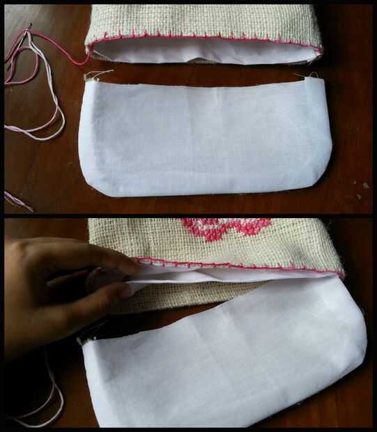 Inserte la lengüeta entre el forro y la tela de aida en la parte posterior de la bolsa. Usar aguja e hilo para coser la tapa con la bolsa. Coser sobre y bajo como se muestra en la última foto de este paso.