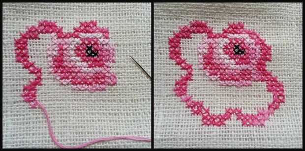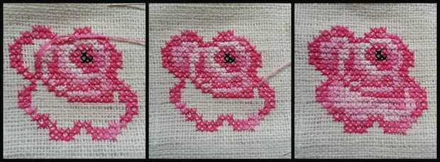 Después Cruz costura el borde de la rosa utilice los tonos más claros del hilo de rosca del bordado para llenar la rosa con punto de Cruz.