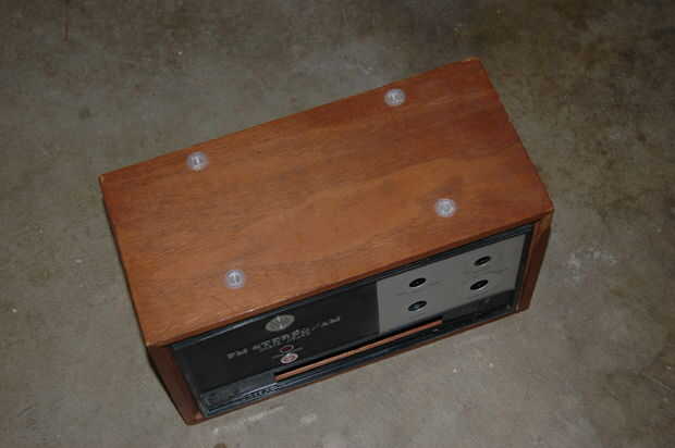 Después de que su radio vintage está vacía, usted necesitará perforar en sus escarpias en la parte superior. Estos actuarán como la base para sostener la torre de radio en su lugar y proporcionar una base sólida. Mis anclajes se colocan unos 6" de ancho y 4 1/2" de profundidad. Esto me permitió poner el altavoz a medio camino encima de la torre.