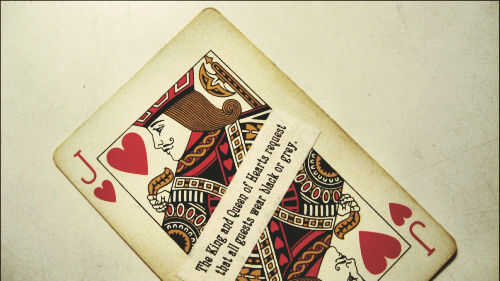 Como magos aficionados y entusiastas de juegos de azar, sabíamos que queríamos incluir una tarjeta de juego de algún tipo y acabó comunicando nuestro código de vestir de esta manera. Cada tarjeta fue sacada de una caja de Pinacle vintage cubiertas {elegido para sus cartas de cara muchos} encontrado en el mercado de pulgas y luego había teñido un pequeño pedazo de papel pegado en el frente. Algunos de los diseños de espalda eran simplemente increíbles, y encontrar tarjetas vintage en grandes cantidades era más fácil que el envejecimiento de nuestra propia.