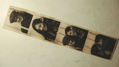 Nuestro pensamiento original era ir a un Fotomatón para tomar estas fotos, pero cuando estábamos casa para el almuerzo un día de trabajo, decidimos hacer nosotros mismos también. Establecer un fondo de tela doblada y vestidas con ropa vintage y planteado frente a nuestro trípode. Después de un arreglo digital de las fotos, las impresas en la misma cartulina pesada como nuestro registro de etiquetas de corte y les teñido, adivinaron it... en el té.