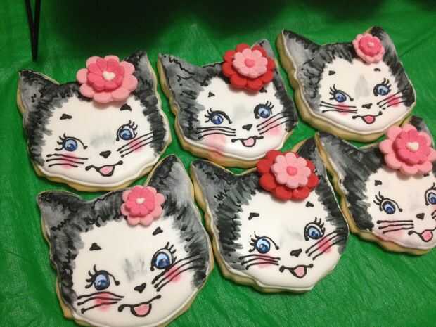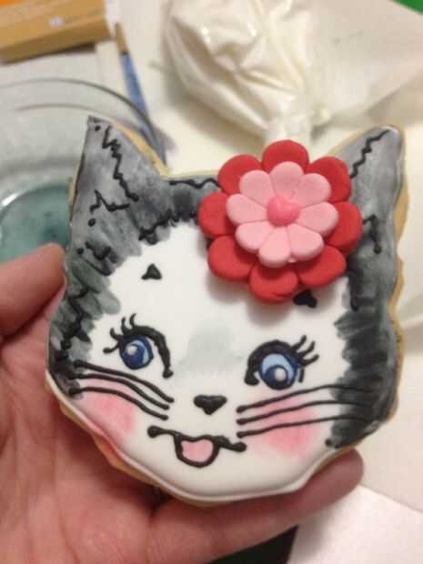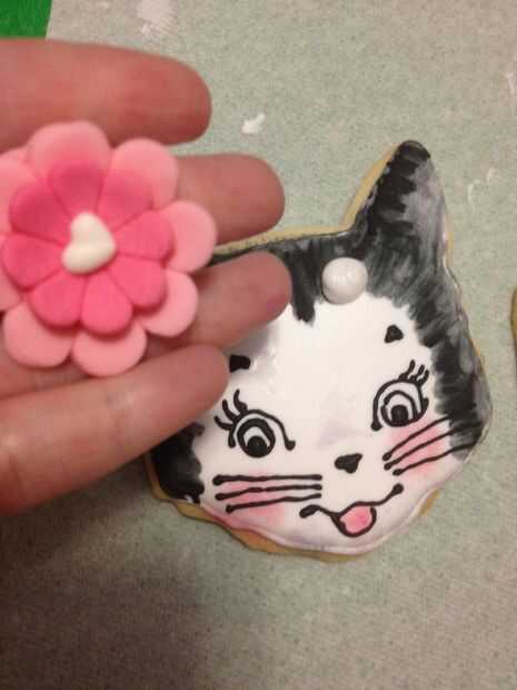 Mis figuritas kitty tenían flores rosas sobre ellos y se me ocurrió que estas flores de hielo eran un ajuste perfecto y emparejó bastante bien. Sólo utilicé una cucharada de glaseado real virar y secar toda la noche.