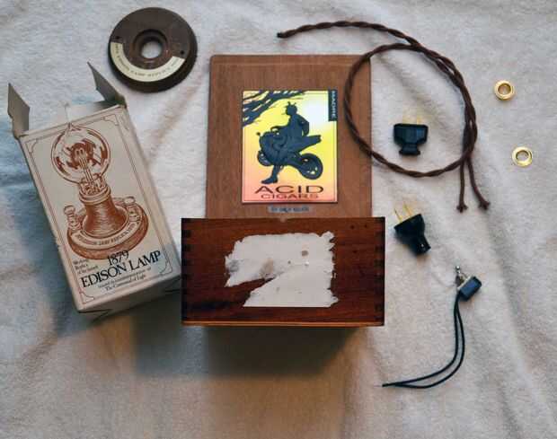 Sólo tenía un montón de cajas de cigarro alrededor para futuros proyectos y dijo que quiero hacer una lámpara de estilo Steampunk, eso es lo que usé como base.