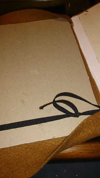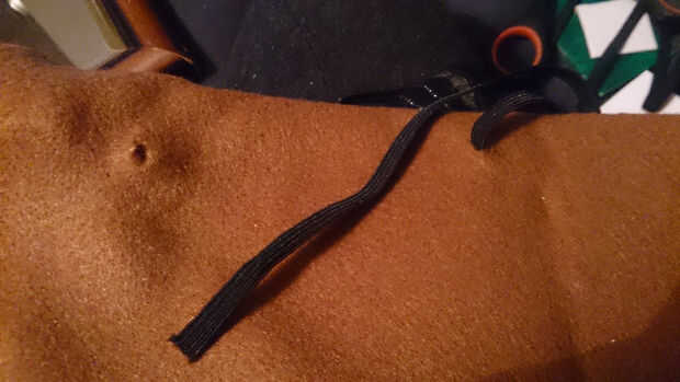 Este paso es como el último paso, solamente que usted necesita para meter cuatro agujeros en el fieltro para el elástico venir a través. Poner la tarjeta en su lugar, meter estos agujeros y dos tiras de hilo de elástico a través de los cuatro agujeros por lo que se ven igual que en mi foto. Atar el elástico en la espalda y corte el sobrante. Luego pegar estos plano a la tarjeta. Continuar doblando el fieltro alrededor de la tarjeta como en el último paso.