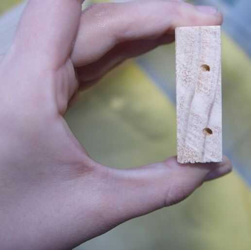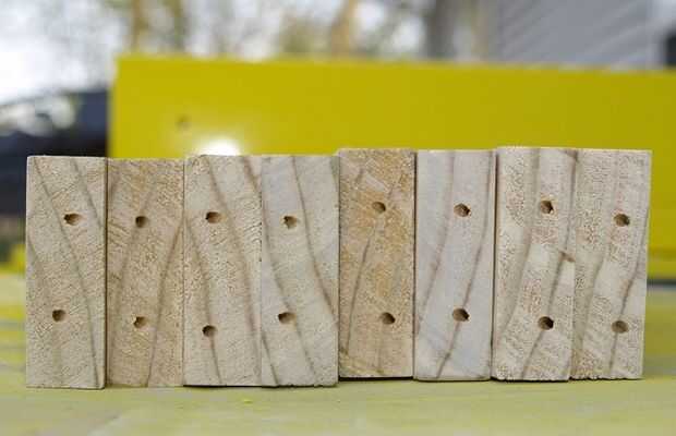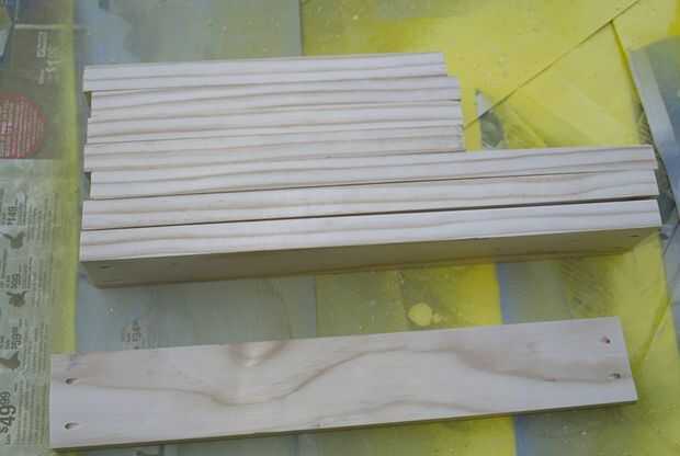 Utilizando cedro 3 en x1 en tablones, cortamos piezas de pequeño soporte. Las piezas se redimensionan encajen entre las patas de la mesa soporte. Cada extremo fue perforado con broca de 1/16. Los agujeros son guías para los tornillos.