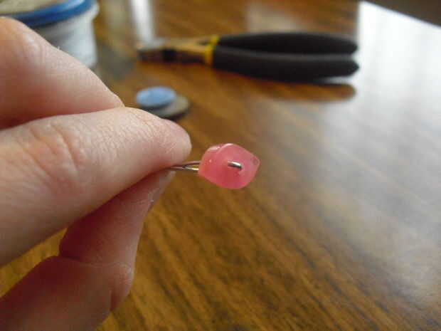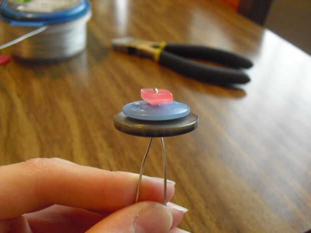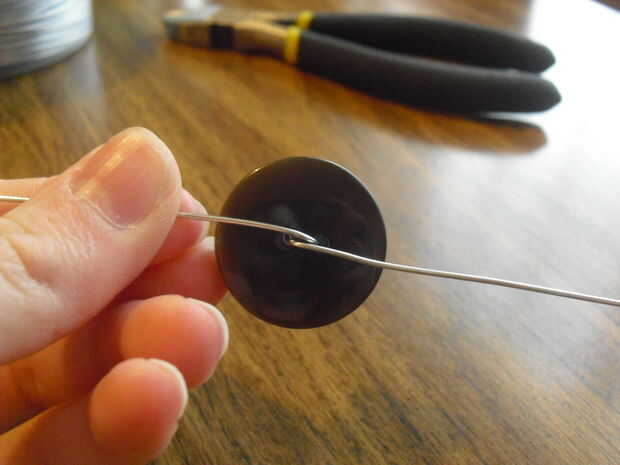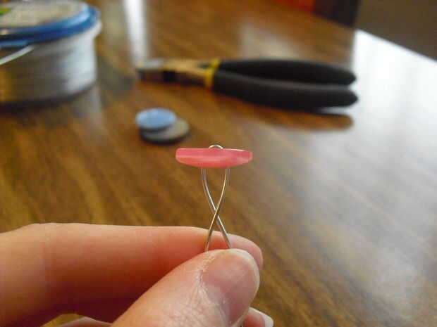 Doblar el alambre por la mitad y empújelo a través del botón superior de su anillo. Asegúrese de que la parte desea hacia arriba tiene el lazo de alambre en ella y no se enfrenta a los dos hilos extremos. A continuación, se alimentan el resto de los botones en el orden que desee.