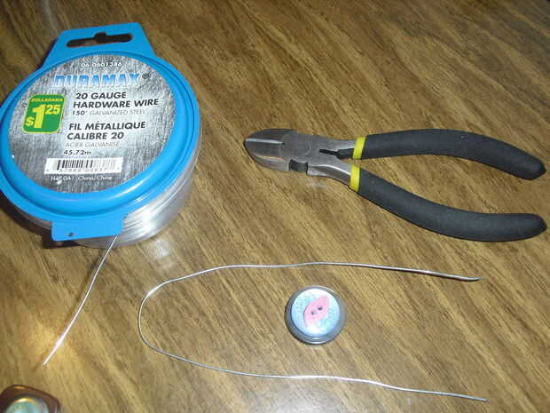 Primeros pasos son colocar sus herramientas, incluyendo el conjunto de botón que eligió, sus cortadores de alambre y alambre. Luego puede cortar un trozo de alambre cerca de 9 a 10 pulgadas de largo (o más, si usted quiere estar seguro, pero creo que 9-10" no tiene demasiado de residuos siendo cómodo para trabajar con).