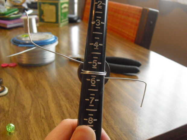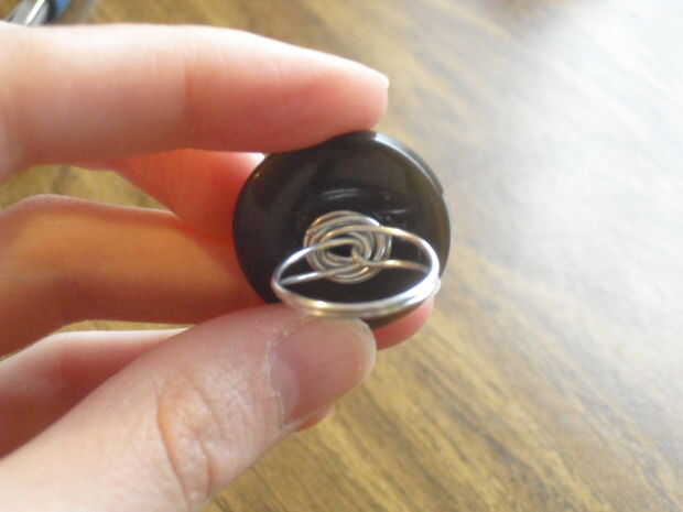 Llevar los dos cables alrededor del mandril, asegúrese de mantenerlos en el mismo lado como estaban cuando se hizo el último giro (lo que significa, no cruzarlos. Mantenga el alambre superior en la parte superior y el alambre inferior en la parte inferior). Abrigo alrededor de nuevo a la parte inferior del anillo y pasarlos por debajo. Ahora va ser pegarse hacia fuera en ambos lados del del anillo "tren de aterrizaje". Esto le dará un concepto abierto agradable ver a tu banda del anillo.