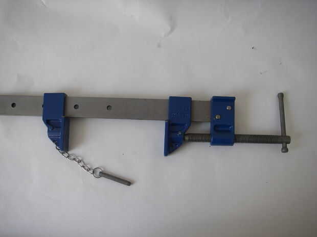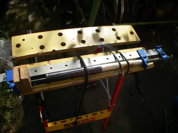 Como se puede ver en la foto, he establecido el marco de la abrazadera (con algunos bloques de madera para proteger el cilindro mandíbulas.) y todo había apretado con cuerdas elásticas.