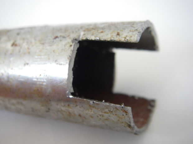 Un tubo con un diámetro de aproximadamente una pulgada es lo que quieres; Usé un viejo poste del asiento de una bicicleta; tomó alrededor de 1 minuto para hacer 3 cortes a cada lado con una sierra para metales.