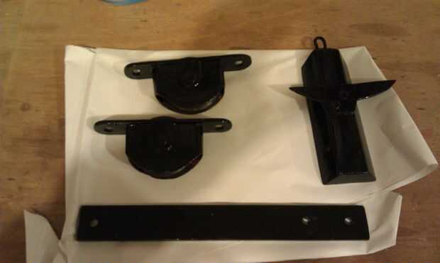 Como ya he dicho antes la mayoría del hardware todavía estaba en gran forma utilizable. Después de la limpieza para arriba se puede ver que las poleas, el indicador de peso y la placa de fijación están listos para la instalación con una capa fresca de pintura negra.