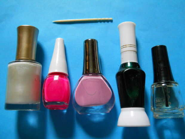 para esto usted necesitan cualquier color de base claro (mi fav-blanco) n rosa oscuro y verde uñas color. uñas arte striper y palillo de dientes