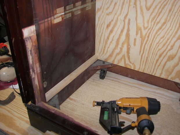 3) la eliminación de la zona del altavoz delantero reveló que necesito para levantar un poco el gabinete nuevo "piso". Usé algunos madera y había hecho dos pedazos después medí la profundidad y la longitud entre la parte delantera y posteriores verticales.