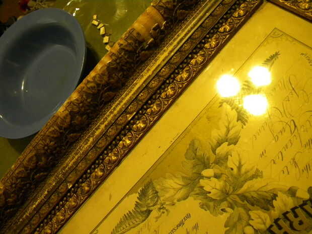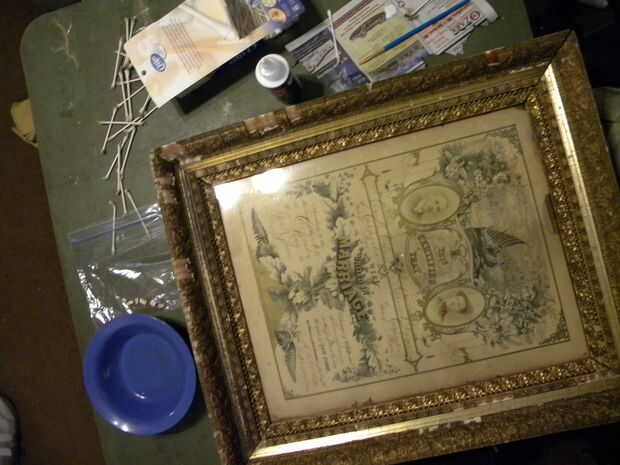 Mi esposa y yo recibió este marco 100 años como un regalo de nuestro amigo, TR, de su colección 50 años de hallazgos de venta de inmuebles. Darlene bajó en amor con el marco, a pesar de había sido dañada - perder gran parte de las tallas doradas oro