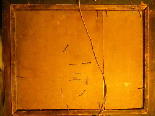 Ahora el marco tiene que ser desmontado. He encontrado varios tipos de clavos. Debido a la edad del cuadro supongo. Utilice las pinzas para sacar los clavos. Este no es lugar para una garra de martillos. Ten mucho cuidado no se agriete la madera como los clavos se salen. Ir lento y constante, va a salir eventualmente. También me pareció que el tablero trasero 2 hojas diferentes de tablero de fibra. No creo que este fue el original. Estoy buscando el tipo correcto de la madera para sustituirlo. Vendrá más adelante. He quitado el cristal, el certificado y el tablero trasero y había colocado en un lugar seguro. El marco se hace de un interno y un marco externo. Liberó los 2 marcos en orden a la reparación individual. Las esquinas donde suelta por lo que necesitaban para ser prensa detrás juntos. Lo hice tocando los clavos que mantienen unidas las esquinas. Esto funcionó bien y como dije antes el lento y constante.