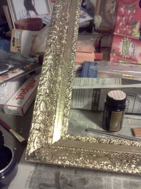 Originalmente iba a salir el oro como es pero al terminar el proceso hojea me di cuenta de que el marco necesario para ser atenuado. Utilicé el esmalte antiguo para darle una mejor apariencia. Este es un paso simple. El esmalte se pinta en luego tomar una toalla de papel o una esponja. Este paso se seca rápido así que cepille en y límpielo. Asegúrese de cepillar en las grietas. tienes que limpiar apagado y mirar por encima de los lugares que necesitan ser más oscuro. También es un buen momento para encubrir sus errores en la etapa hojea oro. El esmalte oscuro se llene en las grietas de la hoja no se pegaría a. Después de cubrir el marco en el esmalte antiguo deje que se seque. Una vez seco su tiempo para rociar en el sellador. No esta al aire libre y asegúrese de cubrir toda la superficie de hoja. Sólo tarda 15 minutos en secar así que si usted quiere añadir una segunda capa será capaz de.