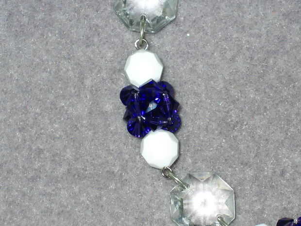 Puse cristales imitación blanco 8mm en los pernos del ojo y luego encadenan los racimos, poniendo un cristal blanco claro en el centro del cúmulo, acabado el enlace con otro cristal blanco de imitación en la parte superior.