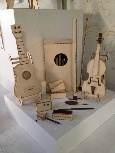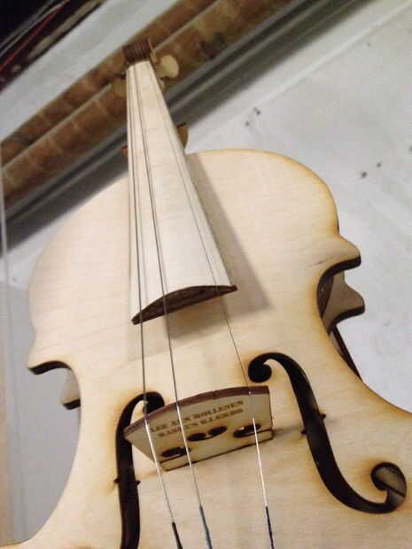 Este violín era la ganadora del concurso Laserworks en hecho Festival en Roskilde, Dinamarca en agosto de 2014. Las reglas del concurso eran simples: crear algo de máximo 5 metros cuadrados 3 mm de madera contrachapada en 8 horas de corte de láser + tiempo de montaje. Mi pareja de concurso y yo habían creado seis instrumentos (violín, ukelele, cajón, tambor de mono, ocarina y güiro/sonajero) con ser responsables principalmente de instrumentos de cuerda.