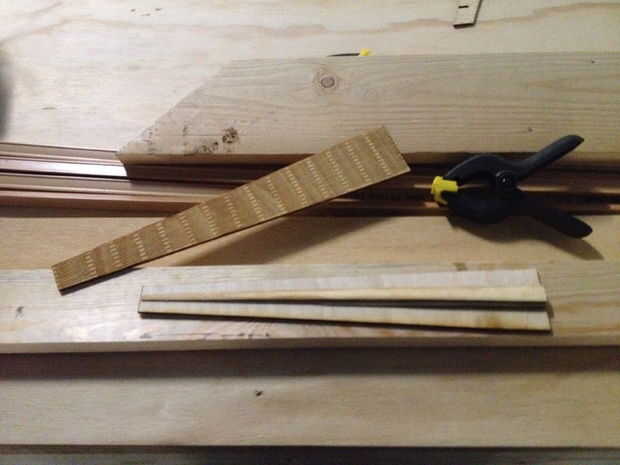 Entonces empapado la junta con agua tibia que hizo contratar a sí mismo. Después de haber preparado la parte inferior del diapasón (una pieza plana y dos piezas más delgados y más cortos en la parte superior - véase el cuadro), he pegado la pieza húmeda en la parte superior y aseguró durante la noche.
