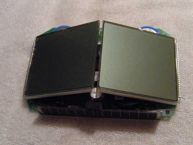 Coloque el dedo en el agujero en el centro de la placa de circuito y retírela de la caja. Fijar la caja a un lado por ahora. Ten mucho cuidado no la rotura o la viruta de los paneles LCD. Creo que no son sustituibles, por lo que eso significaría juego sobre.
