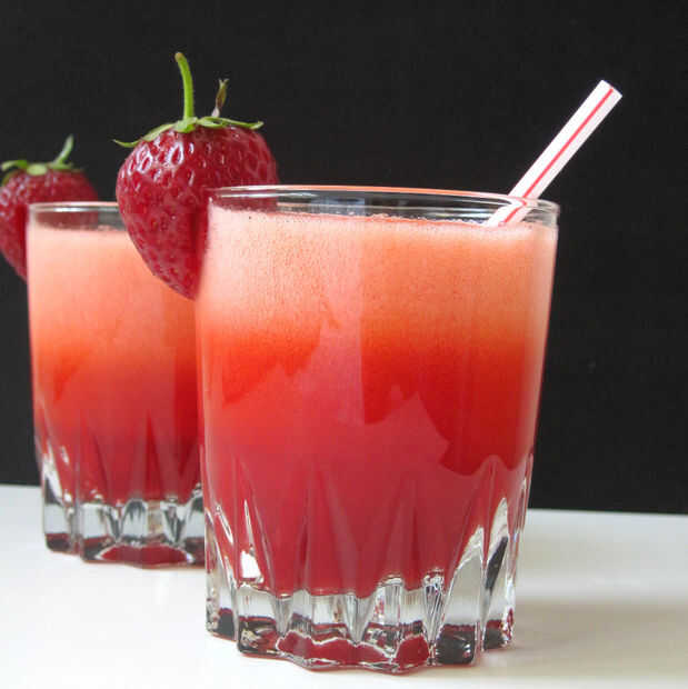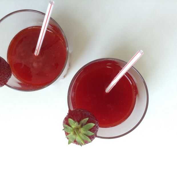 Dividir el jarabe de fresa entre dos vasos y agregar su guarnición o elección. Para la mejor presentación, el jarabe debe llenar casi la mitad de las gafas.