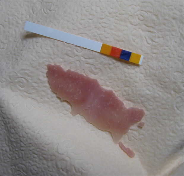 Felicidades, ahora han hecho algo de jabón para bomba-culo. Sin embargo no trate de usar de inmediato. El hidróxido de sodio lleva un tiempo para ser totalmente consumido como reacciona con la grasa. Esperar unas semanas antes de usarlo. Puede supervisar el progreso de su jabón comprobando el pH que bajará de 14 (primera imagen) a 10 (segunda imagen). Buen jabón es pH 7-9.