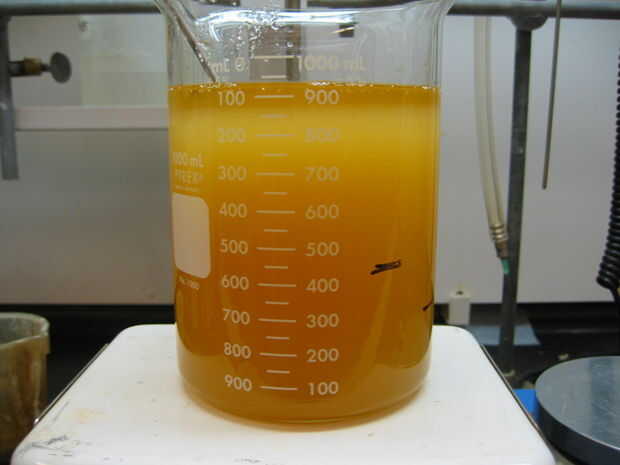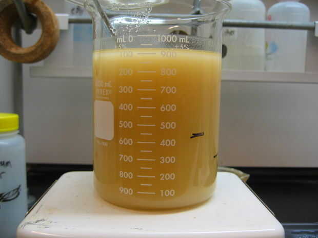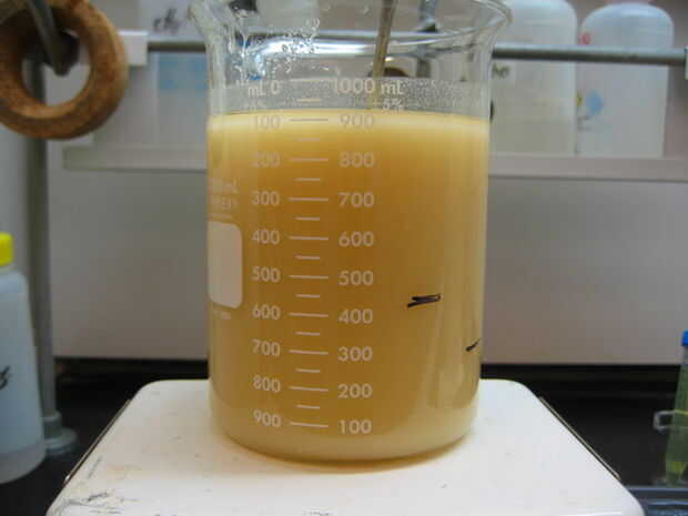 Cuando ambas soluciones son ~ 50 º c, añadir la solución de NaOH a las grasas. Despertar muy bien durante unos 10 minutos, y luego periódicamente en lo sucesivo. La mezcla tendrá nublados y más ligero en color lo que.