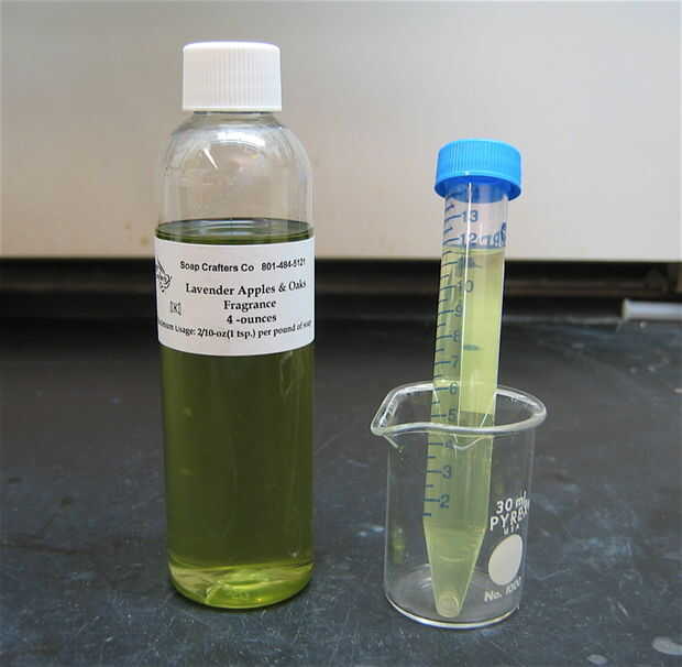 Una vez que ha trazado el jabón, agregue el fragerence de su elección. Estoy utilizando 12 mL de una fragerence de jabón perfumado "lavanda y manzanas". También puede usar un aceite esencial aquí.