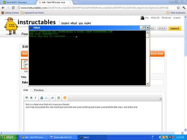 Un virus falso, disfrazando como un anti virus...Paso 1: Hacer el programa... Abrir Bloc de notasEscriba (o copiar) este código:deecho.echo.Eco Animus Anti-Virus Portable (C)echo % hora % % fecha %Eco registrado 6.8.3.837Eco control % cd % para el vi