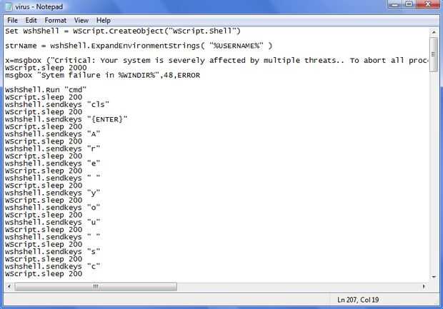 x = msgbox ("crítica: su sistema es afectado severamente por múltiples amenazas... Para anular todos los procesos, pulse 'Cancelar'. Para analizar otra vez, pulse 'Reintentar'. Para seguir todos los procesos, haga clic en 'Omitir'.", 2 + 16," Virus encontrado por Windows Defender © ")