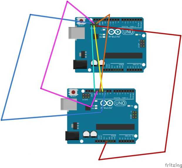 Antes de ejecutar el comando debemos hacer la conexión necessária desde nuestro "Arduino Programador" al Arduino vamos a programar, como nos podemos dar cuenta conectamos el puerto ICSP del microcontrolador (MCU) convertidor USB-Serial un los pines del Arduino en modo programador y alimentamos desde el mismo Arduino.