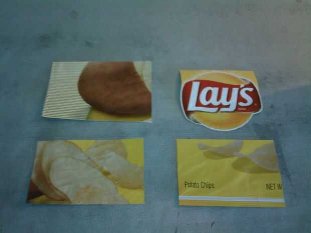 Cortar la parte inferior del monedero de la moneda de un pequeño saco con fusible: (3-1/4 "x 2-1/2")-me gusta la parte que dice "Papas fritas" (foto). Cortar la aleta del monedero de la moneda (3-1/4 "x 2-1/2") - utilizó la insignia de la "endecha" de la pequeña bolsa de viruta y trazada alrededor del diseño (foto)