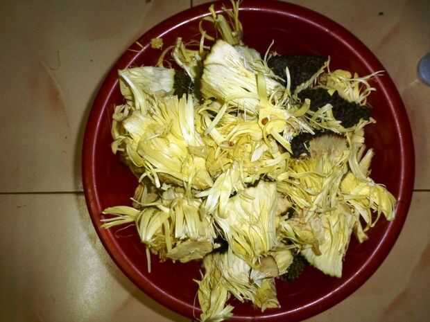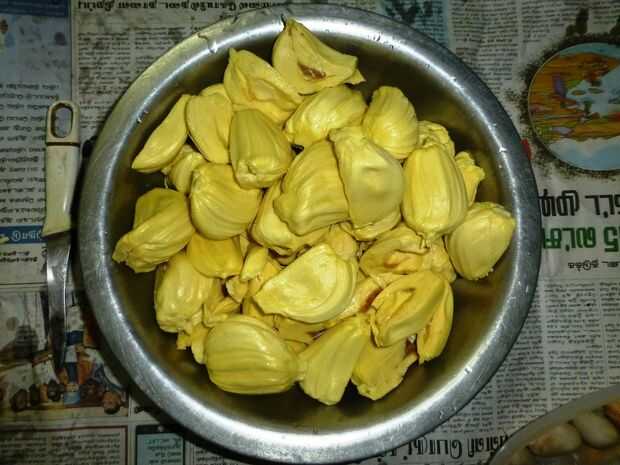 Con el cuchillo aceitado, fractura abierta la yaca y retire la carne una por una. Aceite de las manos y el cuchillo de vez en cuando para evitar que el látex se adhiera.