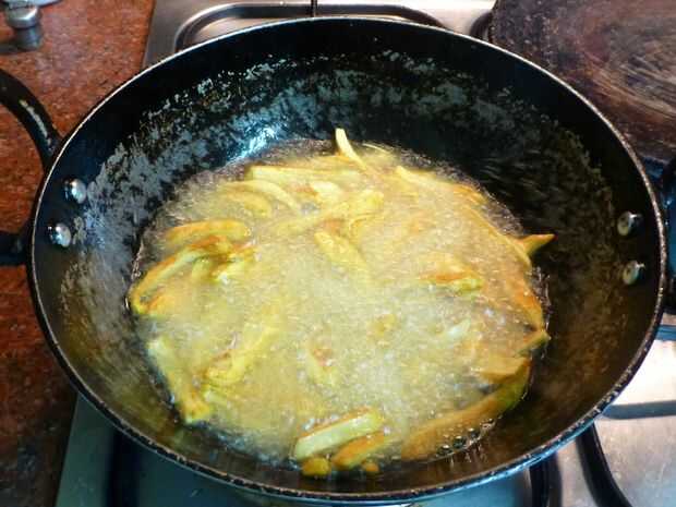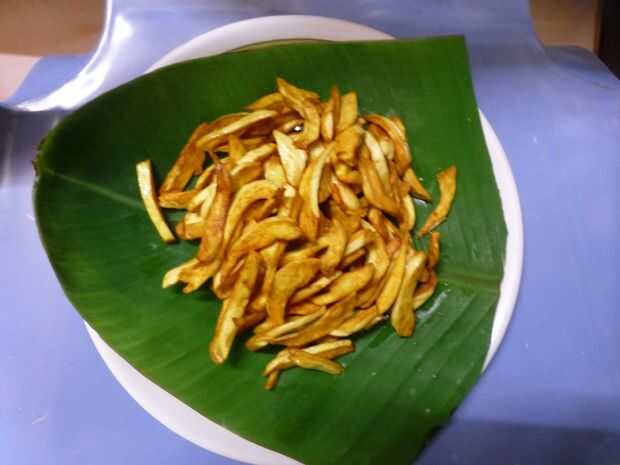 Cuando el aceite esté suficientemente caliente, añadir el jackfruit rebanadas y freír. Remover de vez en cuando para evitar que las rodajas queden pegadas. Cuando las rebanadas se fríen totalmente, retire utilizando un colador y transferirlos a una servilleta de papel o sobre un trozo de hoja de plátano.