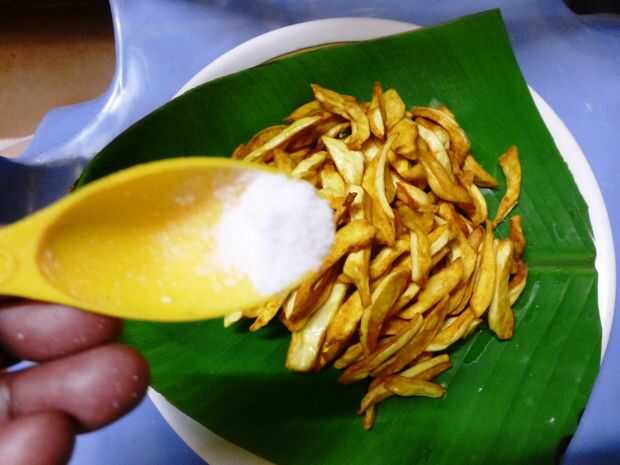 Espolvoree sal sobre las rebanadas de jackfruit frito. Servir con salsa de tomate o salsa de Chile.