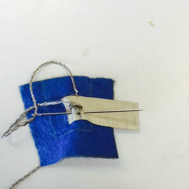 - Coser a mano, a través de una sola pieza de tejido no conductor de hilo conductor (Asegúrese de que va todo el camino a través al otro lado por lo que va a tocar la batería).