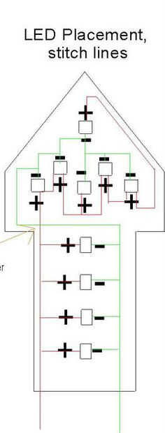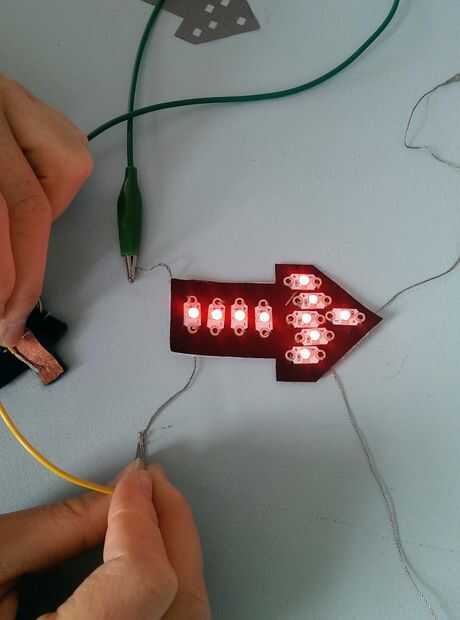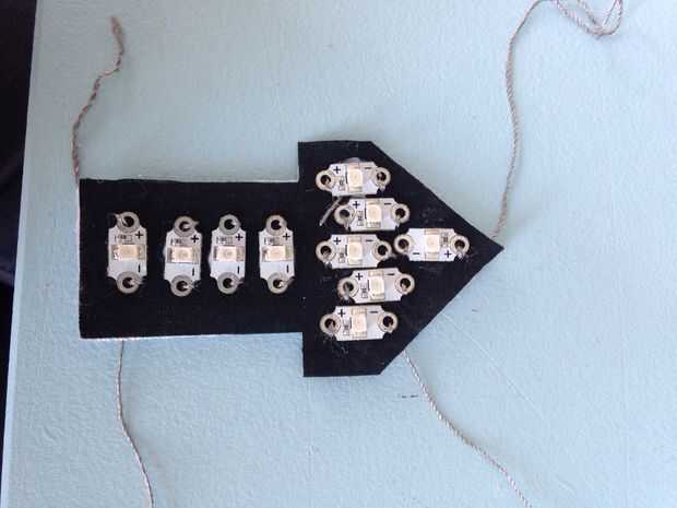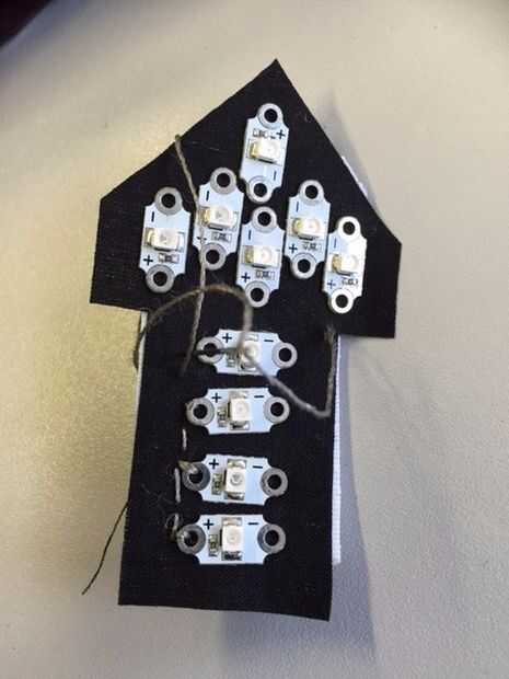 - Cosa de LED que ha sido pegado en la pieza base de tela con el hilo conductor en el patrón que se muestra en la plantilla.