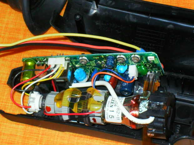 una vieja lámpara led, lente, dos batería de 9 voltios, batería de 3 voltios de 2 o tres (para la luz)