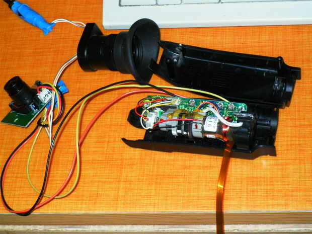 un visor, un cmos de la cámara (de video casa queda), alambre eléctrico, caja de sigar, usb adaptador (12v adaptador de coche/usb)