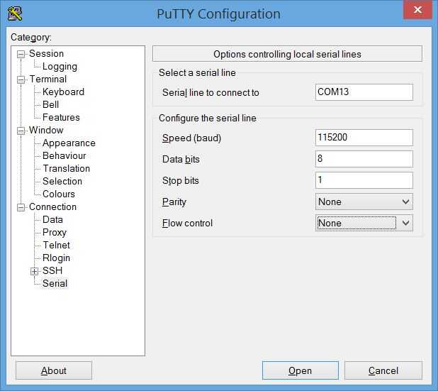 Asegúrese de que utilizar los mismos parámetros de conexión que aparecen en la imagen (115.200 baudios, 8N1, sin control de flujo)