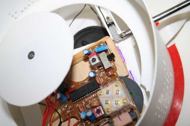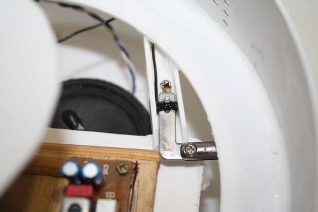 Ahora podemos añadir en el soporte de altavoz y placa de circuito. Coloque el soporte de placa de circuito fueron aproximadamente tengo en el diagrama como esto apoyará a la placa de circuito en la posición más tarde. Pegamento en el altavoz soporte mitad sobresale por debajo del soporte del circuito. Encontré esto produce la mejor calidad de sonido pero si tienes mejor resultado por favor me avisan! También se almacena todos mis cables de repuesto bajo el soporte del circuito para mantener la forma.