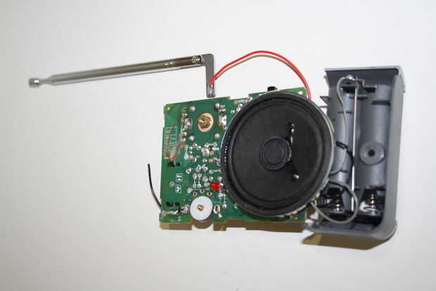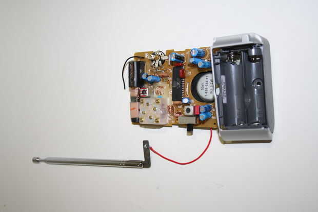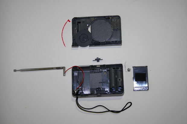 Empezó por desmontar la radio de Sony que nos dieron. Amplié la ariel, batería, altavoz y mecanismo de volumen/encendido que les permitió caber en mi diseño.
