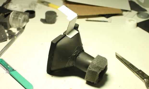 Ahora lo que tienes que hacer es usar la Sintra o cualquier material que es flexible, capaz de molde, delgado y fuerte, hacer un montaje. El Monte debe deslice firmemente el zapato caliente encima de la cámara y coloque en algún lugar en el visor que ha hecho ahora. Si no te gusta ese enfoque puede utilizar imaginación y dos bandas de goma para ir alrededor de la cámara entera. Esta parte es realmente suya.