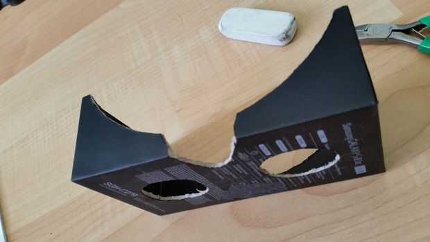 Puede que necesite ayuda de otra persona a la sección de su frente y las mejillas a los lados de la caja. Hacer un rastro áspero inicial cortar con las tijeras, luego mejorar con rastros adicionales y cortes más precisos con el cortador. También puede preparar las secciones primero en papel y transferir a la caja cuando esté satisfecho.