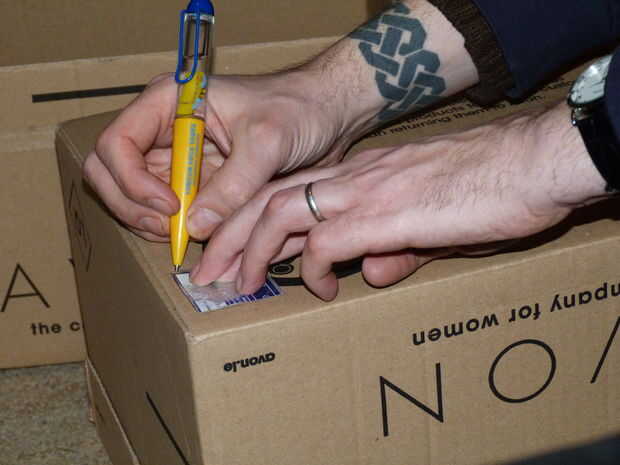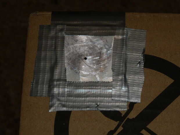 Mi plan original era tener dos cajas de ángulos rectos y tienen el agujero en la parte superior de la caja vertical, en la esquina. Luego, con un espejo en el cuadro inferior, podría reflejar la imagen y ve al lado del agujero de alfiler en el otro lado. Sin embargo nunca hizo este trabajo y cambió mi plan. De todos modos, aquí están las fotos de mi marca y cortar el agujero para el agujero de alfiler y luego sellar la caja completa para impedir la entrada de luz. Finalmente he creado la caja de Dementor, gaffer cinta adhesiva un trozo de tela negra que para hacer una campana de visualización.