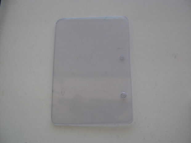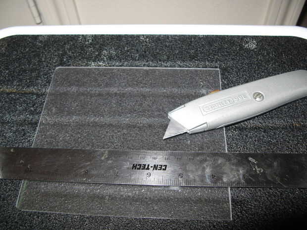 Tomar unos 1/16 de pulgada (aproximadamente) película de plástico transparente y cortar un rectángulo del tamaño adecuado (ver paso anterior). Cortar el rectángulo anotando varias veces a lo largo de una regla de metal con cuchillas, y luego a ajustar a lo largo de la línea (gafas de seguridad!). La primera línea probablemente tendrá que ir todo el camino a través de la pieza de plástico a presión muy bien.