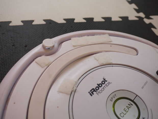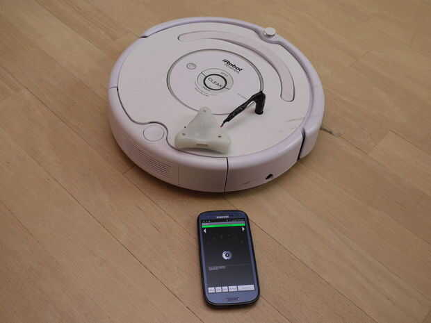 Montar a algún tipo de soporte para su dispositivo que puede colocar a la Roomba. Usted puede hacer uno de un par de trozos de madera o de algunos Legos. Usted puede adjuntar a la Roomba con bandas de goma o con un poco de Velcro. Velcro (o algunos otros sujetadores de gancho y lazo) es un poco más conveniente. Yo simplemente coloque un teléfono que con una banda elástica.
